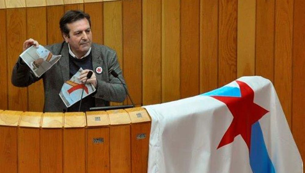 El diputado del BNG Luis Bará ha roto en el estrado del Parlamento de Galicia dos fotografías de Felipe VI para reclamar libertad de expresión, una modificación del Código Penal y exigir la derogación de la denominada ley mordaza.