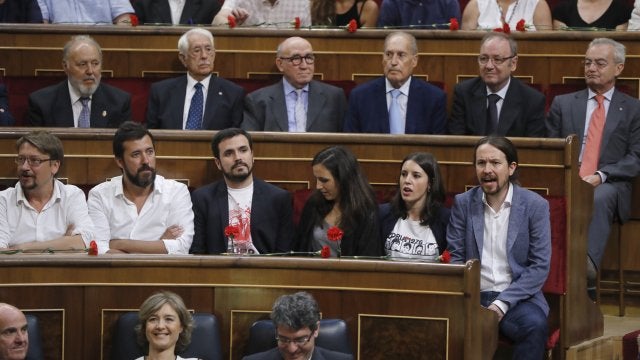 Los diputados de Podemos han mostrado además claveles rojos con los que han querido honrar a los "héroes y heroínas" que lucharon contra la dictadura franquista. Desde una de las bancadas se han escuchado los gritos "Viva el Rey" y "Viva España", que ha sido respondido con la proclama de "Viva la democracia" desde la bancada de Podemos.