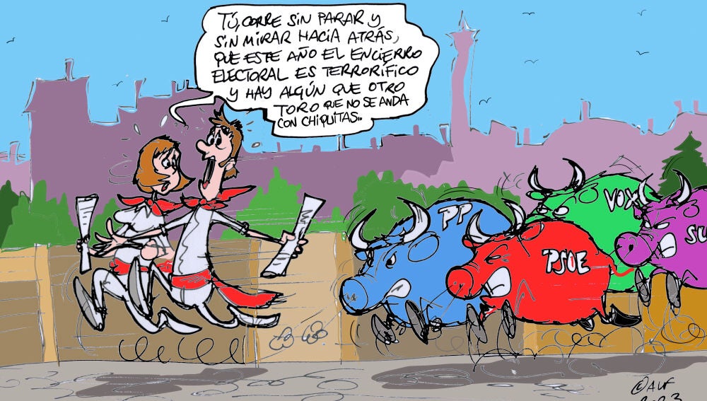 En su viñeta, Alfredo Boto-Hervás muestra a dos mozos corriendo delante de unos toros algo especiales, con los que representa a cuatro de los partidos políticos que este 23J se enfrentan en los comicios: PP, PSOE, Vox y Sumar. Los mozos hablan entre sí. "Tú, corre sin parar y sin mirar hacia atrás, que este año el encierro electorales terrorífico y hay algún que otro toro que no se anda con chiquitas".