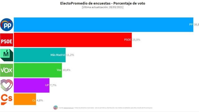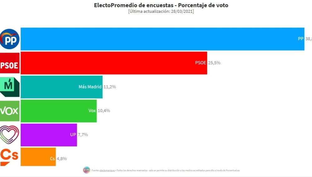 La encuesta para las elecciones a la Asamblea de Madrid de 'Electomanía' da como ganador al Partido Popular con el 38% de los votos, seguido del PSOE que obtendría el 25,5% de los votos en las Elecciones de Madrid del 4 de mayo. La tercera fuerza más votada sería Más Madrid con el 11,2% de los votos. Vox obtendría el 10,4% de los votos, Unidas Podemos el 7,7% y Ciudadanos el 4,8%.
