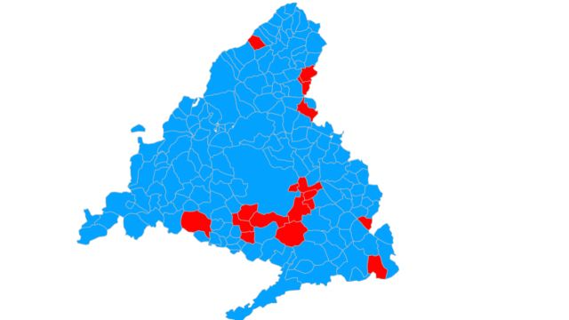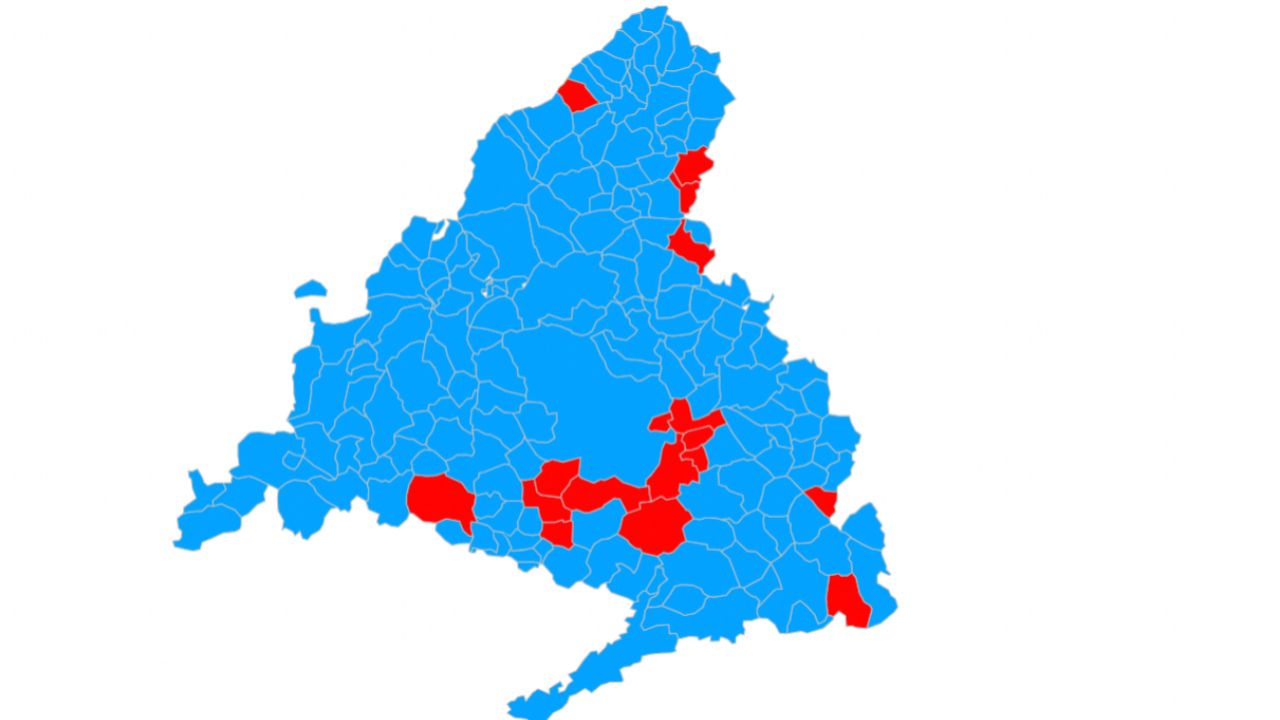 La popular, a la que todas las encuestas hasta el momento dan como gran favorita, pintaría de azul el mapa de la Comunidad de Madrid. De los 179 municipios de la comunidad, el PP se haría la victoria en 162, mientras que en los 17 restantes ganaría el PSOE de Ángel Gabilondo.