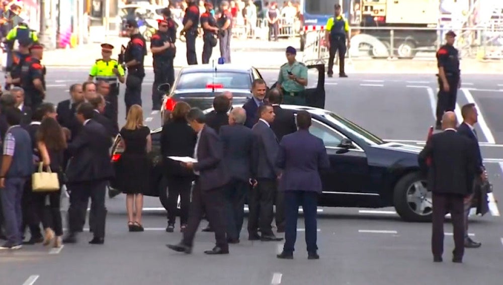 El presidente de la Generalitat, el presidente del Gobierno y la alcaldesa de Barcelona recibieron al Rey en el paseo de Gràcia de Barcelona, al llegar a la manifestación. Carles Puigdemont, Mariano Rajoy y Ada Colau saludaron al monarca en medio de una intensa pitada y gritos de 'fuera, fuera', tras lo cual se dirigieron a pie hacia la cabecera, junto a la Gran Via.