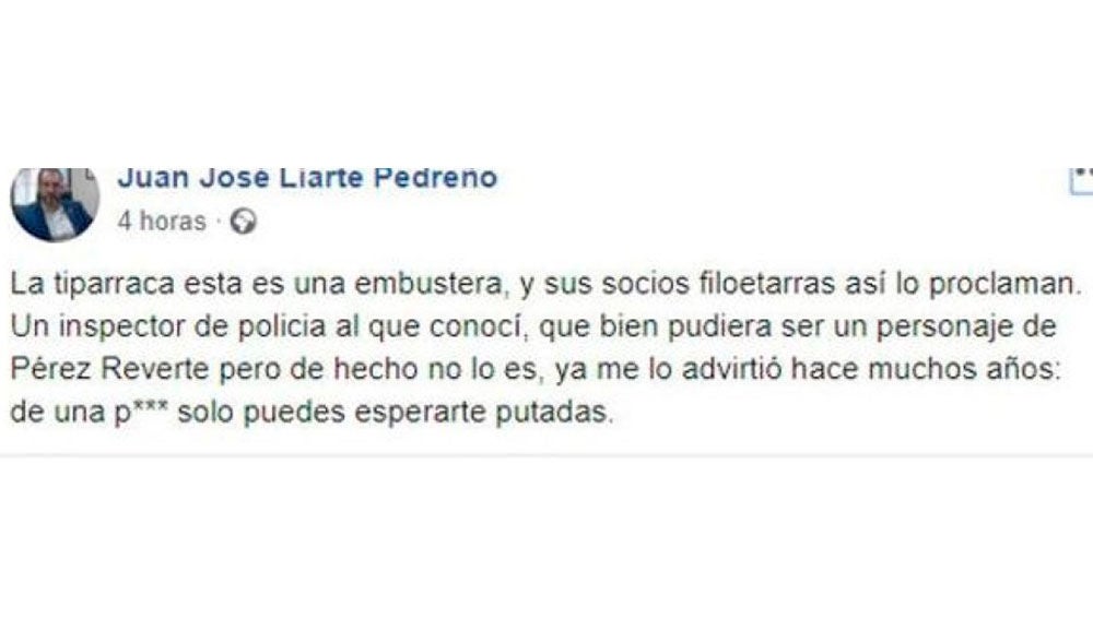 Tras el aluvión de críticas, Liarte eliminó este mismo domingo la publicación para después publicar una aclaración. "Parece que no me he explicado bien", ha señalado, para después apuntar que con esa frase no se refería a Delgado, "sino a un señor de Bildu".