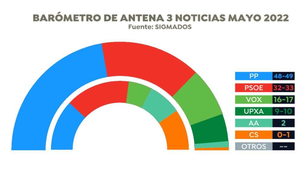 El Partido Popular ganaría con autoridad frente al PSOE las elecciones en Andalucía del próximo 19 de junio. De acuerdo con la última encuesta de Sigma Dos para Antena 3 Noticias realizada este mes de mayo, los 'populares' lograrían más escaños (48-49 con una intención de voto del 35,9%) que la suma de todos los partidos de izquierdas (43-45). De este modo, el PP subiría 22-23 escaños respecto a 2018.