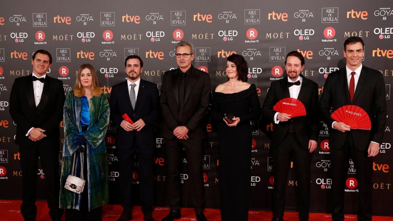 Pedro Sánchez, Pablo Iglesias y Alberto Garzón se unieron hoy a la reivindicación femenina sobre la alfombra roja de los Goya portando los abanicos rojos que simbolizan la campaña "Más mujeres" impulsada por Asociación de Mujeres Cineastas.