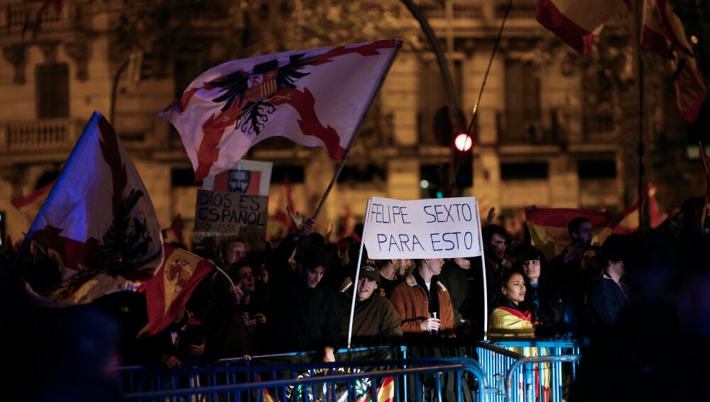 Así, se han podido escuchar gritos de 'Sánchez, hijo de puta', 'Puigdemont a prisión' o 'No es una sede, es un puti club', junto a consignas contra los medios de comunicación, como 'Prensa manipuladora'.