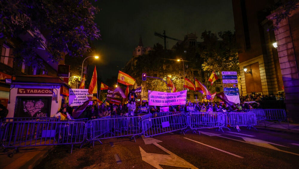 La nueva movilización transcurre de forma pacífica, sin incidentes. Siguen los gritos y abucheos contra Pedro Sánchez y muestran su rechazo al acuerdo entre Junts y PSOE.