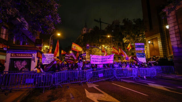 Portando banderas de España, algunas con el escudo recortado, y entre gritos de 'Sánchez a prisión ' y a favor de la unidad de España, la manifestación se estaba desarrollando con normalidad, pero sobre las 22.00 horas, la tensión se ha ido incrementando. Los manifestantes más radicales han comenzado a situarse en la primera fila y con las caras tapadas han empezado a lanzar petardos, cristales y otro tipo de objetos contra los agentes y la prensa.