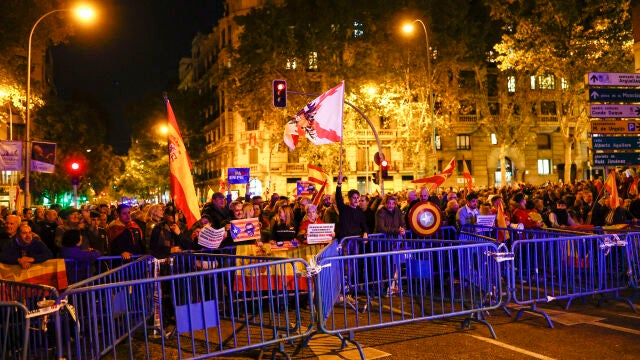 Alrededor de las 19:30 horas ya se concentraban cientos de manifestantes lanzando las proclamas escuchadas estos días como 'no es una sede, es un puticlub'; 'Sánchez, si tienes cojones convoca elecciones'; 'Puigdemont a prisión'; 'en tiempos de rojos hambre y piojos' o 'socialistas, terroristas'. Entre otros cánticos, los manifestantes han pedido en reiteradas ocasiones una huelga general en contra de la ley de amnistía y contra el Gobierno que consideran "golpista".