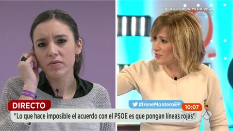 Irene Montero, diputada de Podemos, ha explicado en una entrevista en Espejo Público que su grupo "no pierde la esperanza" sobre la posiblidad de que finalmente puedan contar con cuatro grupos parlamentarios renunciando a la financiación que esto supondría porque están pidiendo "un guiño a la ciudadanía y a la diversidad territorial". Del mismo modo, la parlamentaria ha criticado que los socialistas no implementen medidas concretas para que sus políticos abandonen las puertas giratorias así como que impongas "líneas rojas" para sentarse a dialogar.
