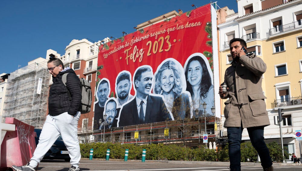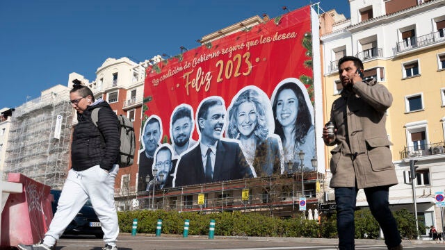 Miércoles 28 de diciembre, día de los inocentes, y de las inocentadas. Y no es una de ellas que en la calle en la que se encuentra la sede del PSOE, en un edificio cercano, se haya desplegado una enorme pancarta con las caras muy sonrientes del presidente Pedro Sánchez, la vicepresidenta de Unidas Podemos, Yolanda Díaz, la ministra de Igualdad, Irene Montero, el portavoz morado Pablo Echenique, Gabriel rufián, portavoz parlamentario de Esquerra Republicana y Arnaldo Otegi, líder de EH-Bildu, bajo el lema: "La coalición de Gobierno seguro que les desea Feliz 2023".