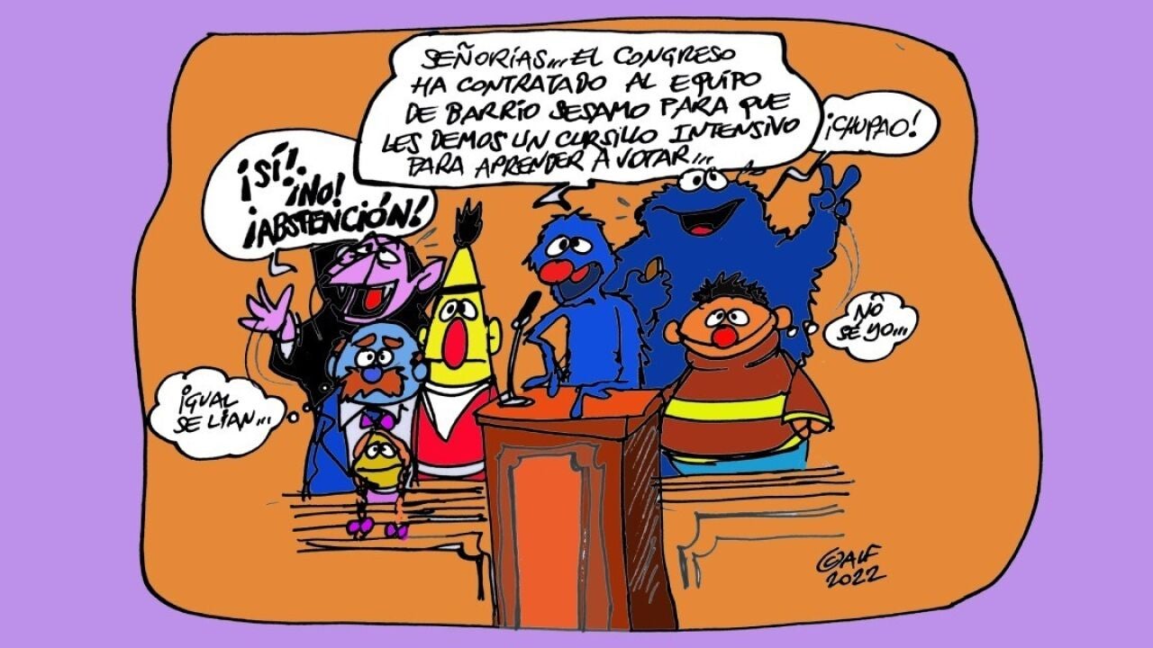 Pero el error del diputado Casero no es el único que se ha producido en el hemiciclo. "Señorías, el Congreso ha contratado al equipo de Barrio Sésamo para que les demos un cursillo intensivo para aprender a votar", reza la viñeta gráfica de esta semana.