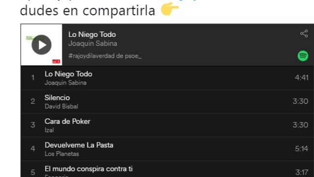 La lista de reproducción de los socialistas incluye temas de título tan explícito como 'Devuélveme la pasta' o 'Lo niego todo'.