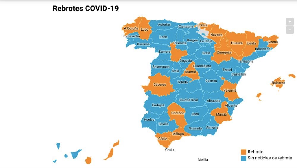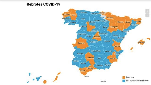 Los rebrotes de coronavirus en España están presentes ya en más de 10 provincias a día de hoy, jueves 25 de junio, durante la nueva normalidad.