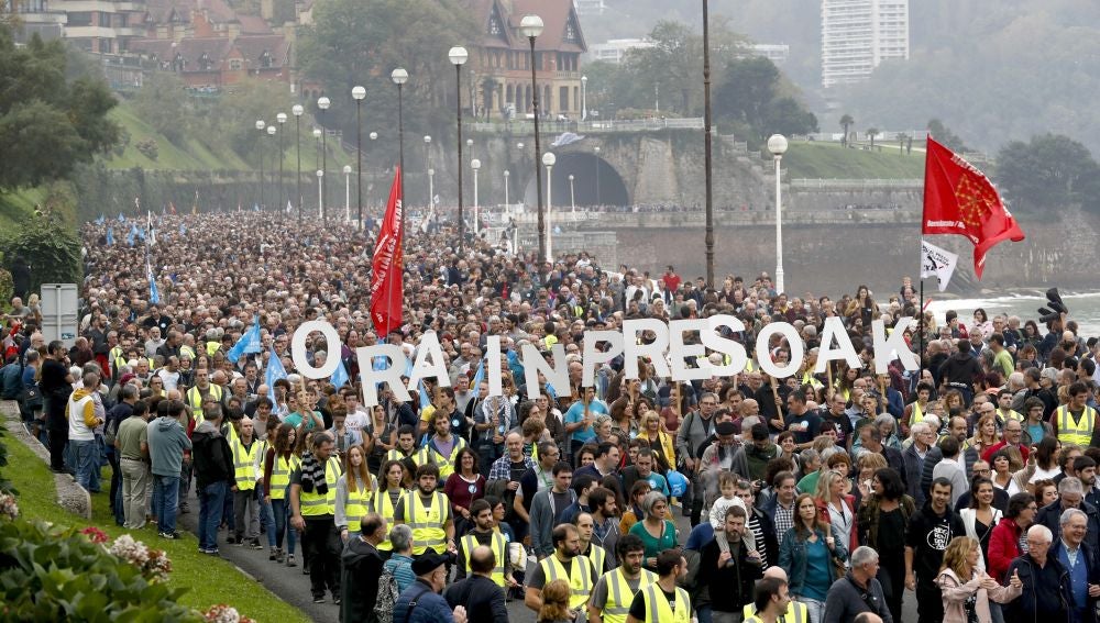 Miles de personas -41.000 según los organizadores- han tomado parte este sábado en San Sebastián en la manifestación convocada por la dinámica Orain Presoak a favor de los derechos de los presos de ETA en la que han apostado por "trabajar juntos para acabar con el sufrimiento".