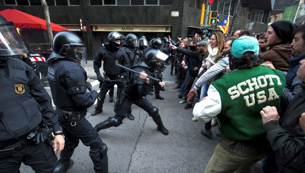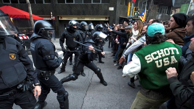 Durante horas, los concentrados arrojaron todo tipo de objetos contra los antidisturbios, como disolvente, espray antipersona, contenedores, botellas, pintura y huevos y les vaciaron un extintor, mientras que los Mossos cargaron varias veces y dispararon salvas para mantener el cordón policial, hasta que la concentración fue disuelta y grupos de alborotadores incendiaron y cruzaron decenas de contenedores en las calles del centro de Barcelona.