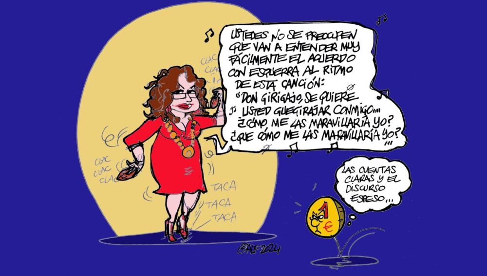 "Ustedes no se preocupen que van a entender muy fácilmente el acuerdo con Esquerra al ritmo de esta canción: Don girigajo se quiere usted guegirajar conmigo... ¿cómo me las maravillaría yo? ¿Qué como me las maravillaría yo?", se lee en la viñeta. Como respuesta, el euro dice: "Las cuentas claras y el discurso espeso...".