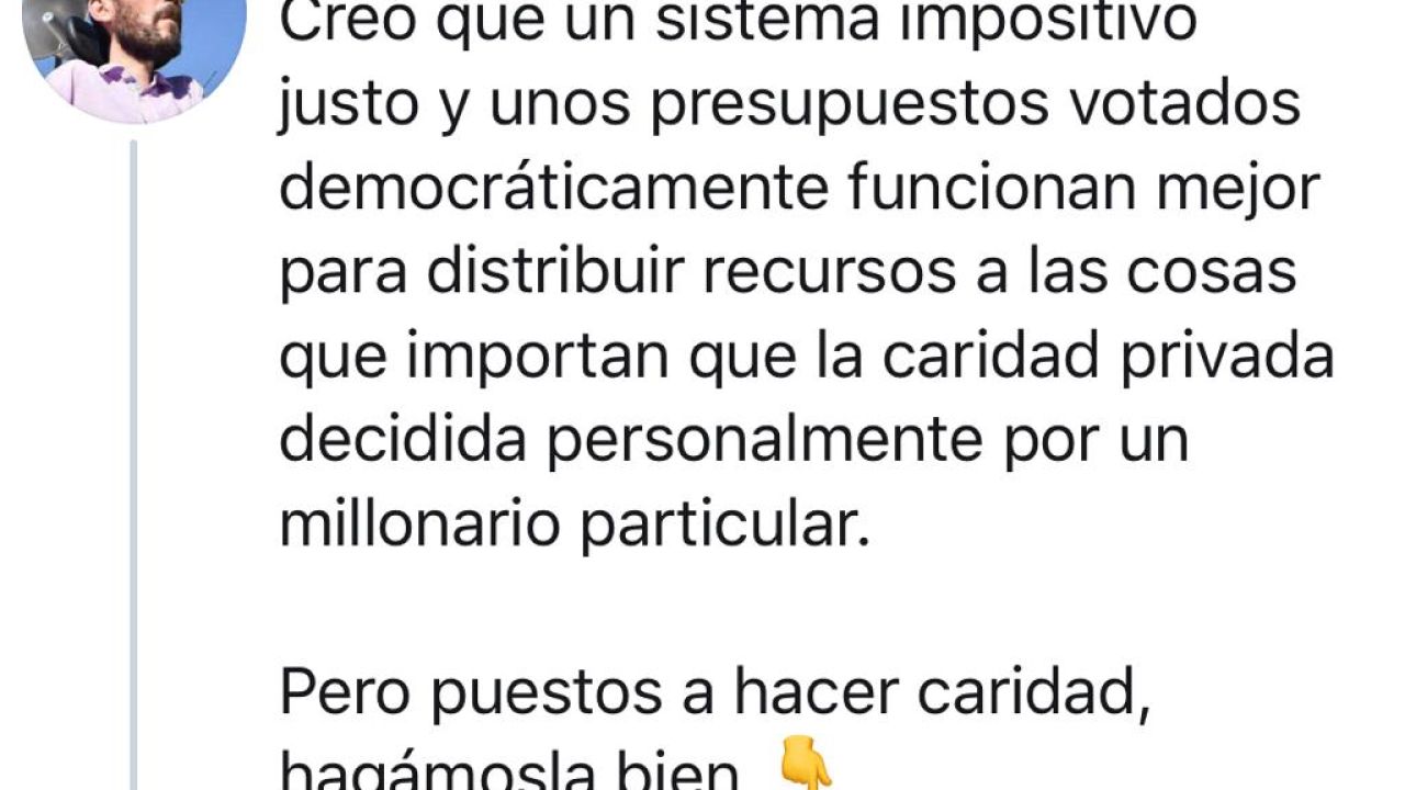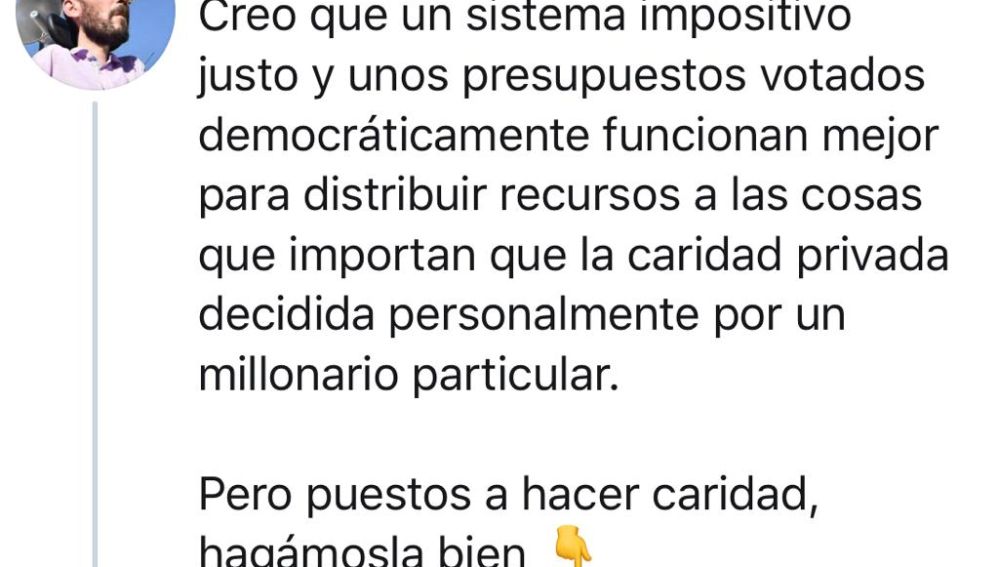 El portavoz de Unidas Podemos en el Congreso, Pablo Echenique, vuelve a criticar las donaciones privadas para luchar contra el coronavirus. Prefiere impuestos u otra forma de colaboración. En sus redes sociales ha difundido este mensaje: "Creo que un sistema impositivo justo y unos presupuestos votados democráticamente funcionan mejor para distribuir recursos a las cosas que importan que la caridad privada decidida personalmente por un millonario particular. Pero puestos a hacer caridad, hagámosla bien". Echenique y otros dirigentes de Podemos, entre ellos Pablo Iglesias, han señalado en varias ocasiones al dueño de Inditex, Amancio Ortega, por no estar de acuerdo con sus contribuciones económicas a diferentes iniciativas ante la crisis sanitaria del coronavirus.