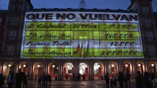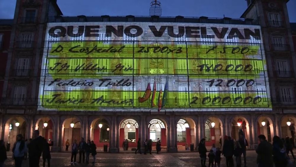 La Plaza Mayor de Madrid estuvo iluminada durante dos horas en la noche del pasado sábado. En la fachada de la Casa de la Panadería se podía ver imágenes donde aparecían los nombres de 'M.Rajoy' y R.Rato', planos de distintos dirigentes del PP con las anotaciones del extesorero Luis Bárcenas sobreimpresas e imágenes de Albert Rivera y Pedro Sánchez con la frase "pero tampoco te conformes".