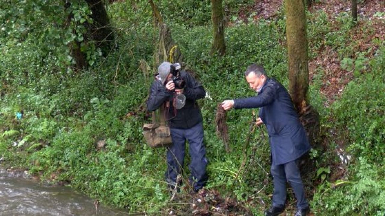 El popular Agustín Hernández se acercó al río Sar a denunciar la contaminación y, después de recoger algunos de los residuos enterrados, los lanzó de nuevo al río, quedando inmortalizado por las cámaras.