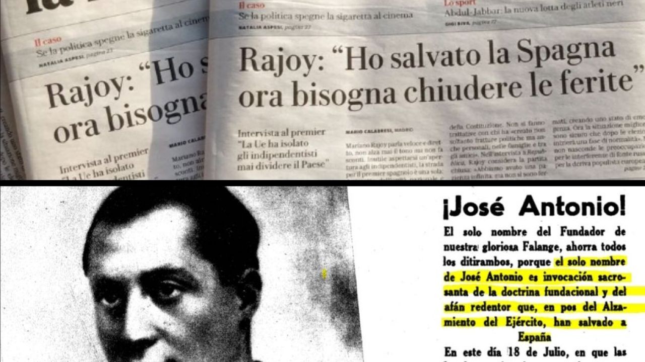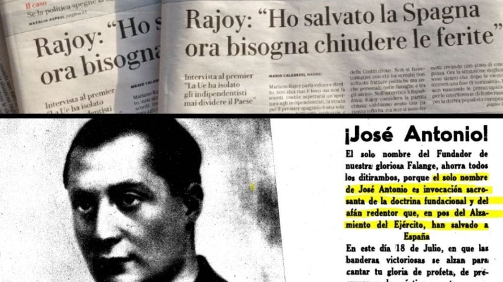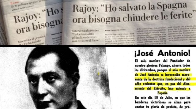 Puigdemont destaca el titular que ha dejado Rajoy en una entrevista en la que dice haber salvado a España y lo equipara con un texto de la Falange que incluye la imagen de Primo de Rivera.