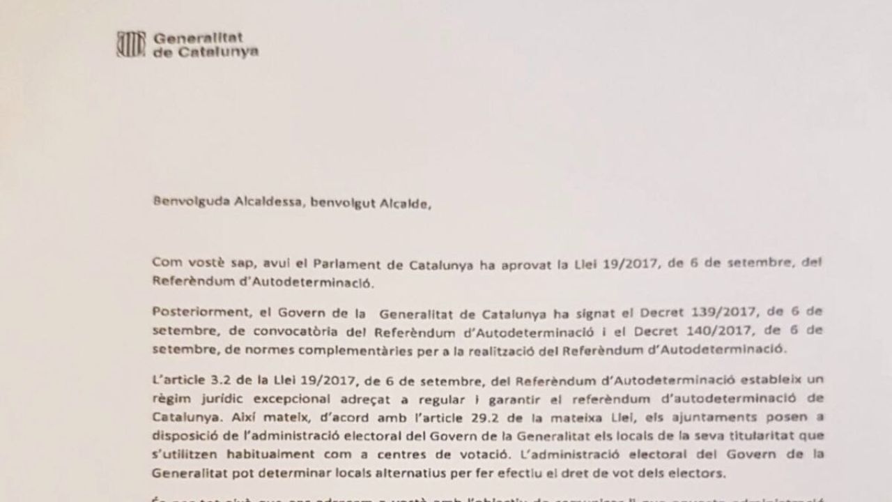 El presidente de la Generalitat, Carles Puigdemont, y el vicepresidente, Oriol Junqueras, han enviado una carta a los alcaldes catalanes para avisarles de que deben ceder para el referéndum del 1 de octubre los locales que habitualmente se utilizan como puntos de votación, y dan 48 horas para confirmar que así se hará o bien para comunicar cualquier cambio o alegación. La misivA está firmada por Puigdemont y por Junqueras, y se envió inmediatamente después de la firma del decreto de convocatoria del referéndum el miércoles en el Parlament --está fechada a 6 de septiembre--.