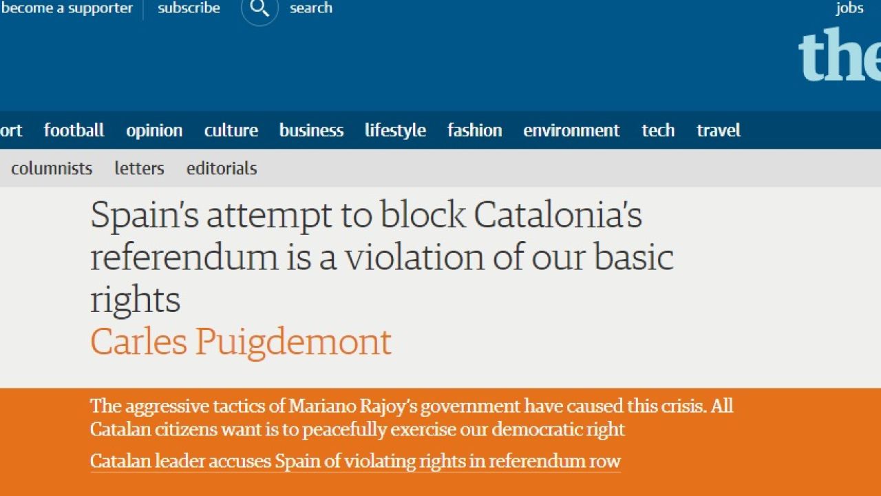 Fuentes del Ejecutivo han calificado así ese artículo en el que Puigdemont hace un llamamiento a la comunidad internacional para que respalde a Cataluña en su defensa de la democracia y acusa al presidente del Gobierno, Mariano Rajoy, de tergiversar la ley, incluida la Constitución española, para que "se ajuste a sus propios fines políticos".