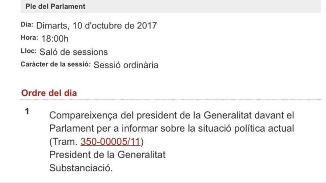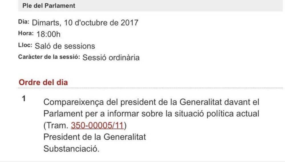 La Junta de Portavoces del Parlament ha acordado que el martes 10 a las 18:00 horas se celebre un Pleno en cuyo orden del día figura la comparecencia de Carles Puigdemont a petición propia. La presidenta del Parlament, Carme Forcadell, ya ha hecho la convocatoria de forma oficial. El presidente de la Generalitat había presentado un documento en el que solicitaba esa comparecencia a petición propia para explicar "la situación política actual", sin una referencia expresa a las palabras 'referéndum o 'independencia' en un intento de sortear la acción del Tribunal Constitucional.