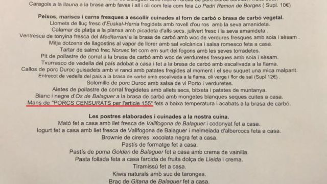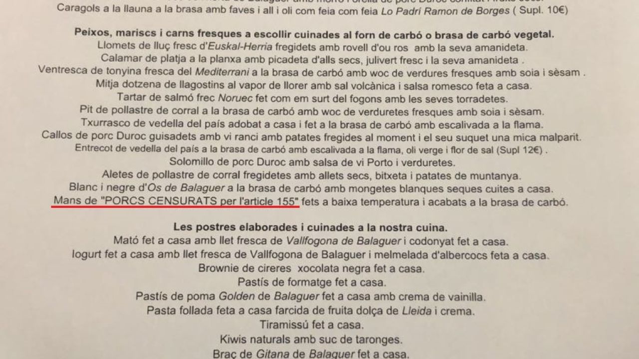 Toni Punyet, dueño del restaurante Nova Font Blanca, vuelve a insistir en el 'Guardia civil andaluz a la brasa', esta vez acompañando a un 'Trinchado de coles y patatas'. Uno de los segundos es 'Manos de cerdos censurados por el articulo 155'. Y para beber: 'Vino de nuestra tierra 'libre si dios quiere''. La carta la remata la frase: "Salud y república, y que Dios nuestro señor os guarde".
