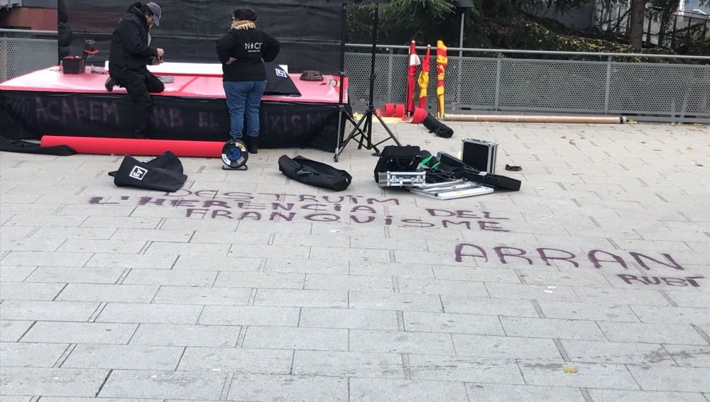 El escenario del mitin de Miquel Iceta en Rubí, en Barcelona, ha amanecido lleno de pintadas. "Destruyamos la herencia del franquismo", señala. Lleva la firma de Arran, organización considerada como las juventudes de la CUP.