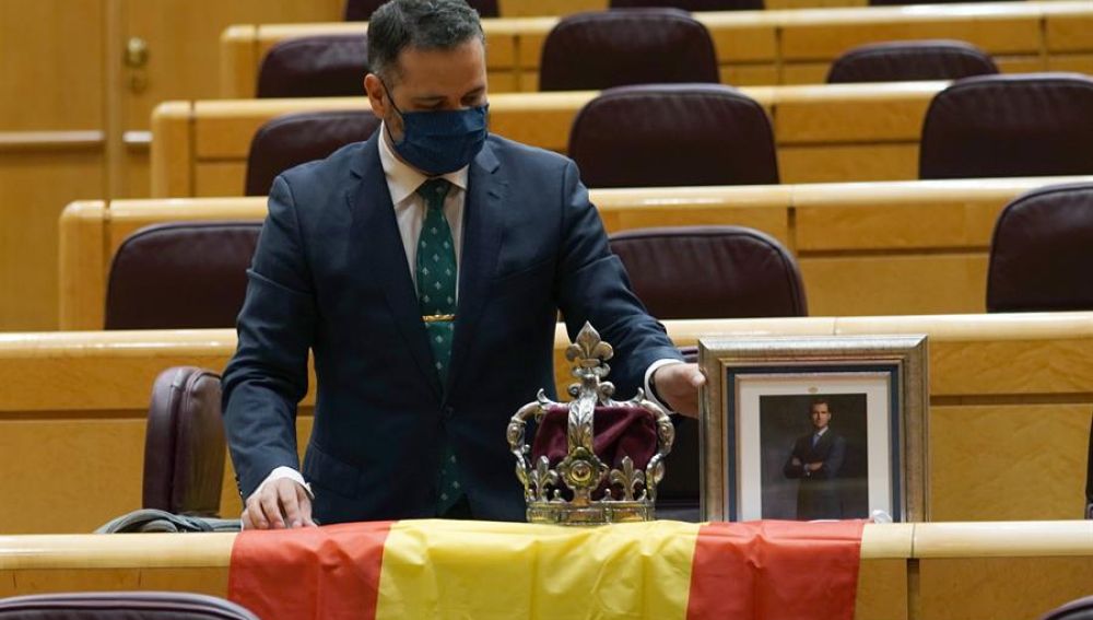 El senador del PP por Ceuta ha desplegado la bandera de España, una reproducción de una corona y un retrato oficial del rey a la entrada de Iglesias en el Senado.