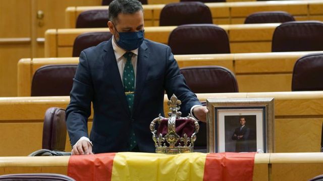 El senador del PP por Ceuta David Muñoz ha recibido al vicepresidente segundo del Gobierno, Pablo Iglesias, con una peculiar exposición en su escaño para reivindicar la figura de Felipe VI, consistente en una bandera nacional, una reproducción de una corona y un retrato oficial del monarca.