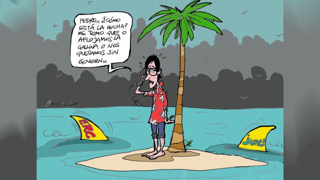 "Pedro... ¿cómo está la hucha? Me temo que o aflojamos la gallina o nos quedamos sin Govern", dice Salvador Illa a Pedro Sánchez, representados en la viñeta gráfica de Alfredo Boto-Hervás, donde aparece en una isla desierta rodeado de 'tiburones'.