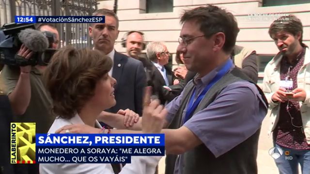 Uno de los fundadores de Podemos, Juan Carlos Monedero, se ha acercado este viernes en el patio del Congreso a la vicepresidenta del Gobierno en funciones, Soraya Sáenz de Santamaría, para dejarle claro lo bien que ha recibido la salida del PP del Ejecutivo.