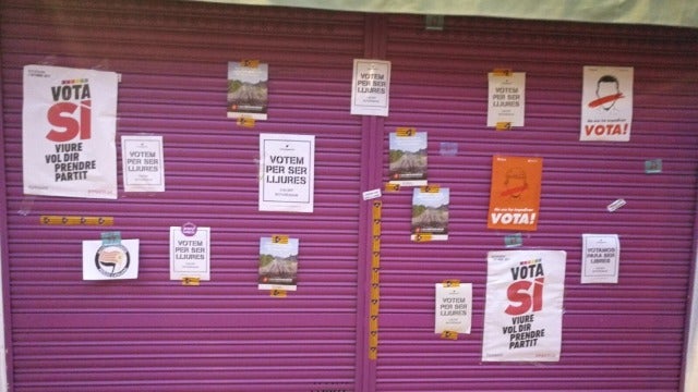Junto a estas pintadas han aparecido también varias pegatinas y carteles independentistas en los que puede leerse "Votemos para ser libres", "!Vota!", "Vivir quiere decir tomar partido" o la imagen del anuncio oficial de la Generalitat sobre el 1-O en el que aparecen dos vías de trenes.