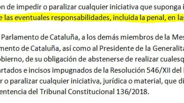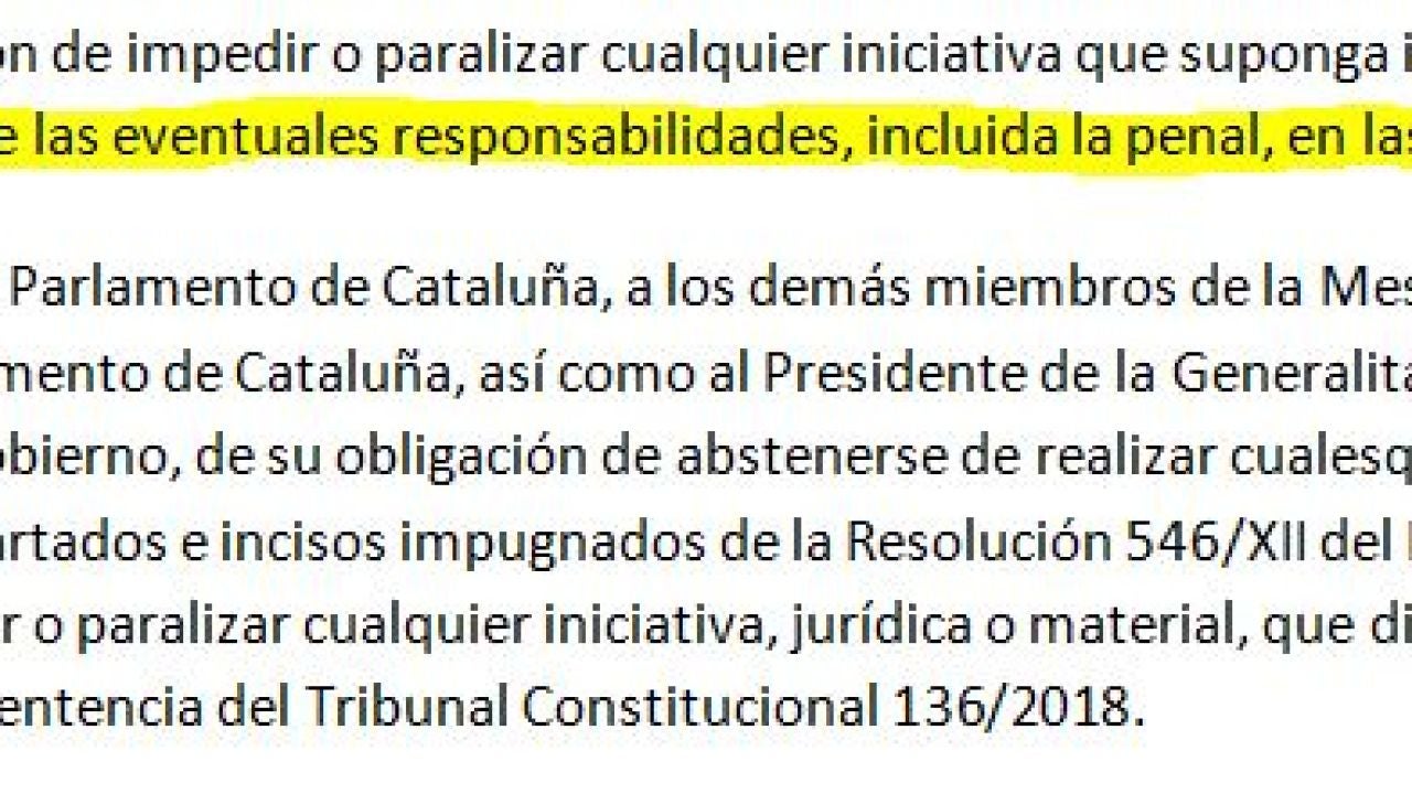 Seria advertencia del Tribunal Constitucional al presidente de la Generalitat y al resto del Govern. Por primera vez les advierte del riesgo penal de incurrir en un delito de desobediencia si no acata la suspensión de los acuerdos del Parlament sobre el derecho a la autodeterminación y la legitimidad de la desobediencia civil.