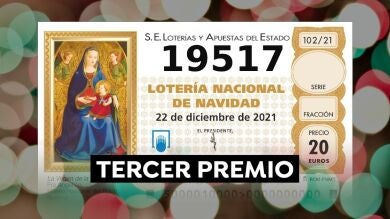 El tercer premio de la Lotería de Navidad es para el número 19517. ¡Enhorabuena! el tercer premio del Sorteo de Navidad 2021 está dotado de 50.000 euros al décimo, 500.000 euros a la serie por Loterías y Apuestas del Estado.