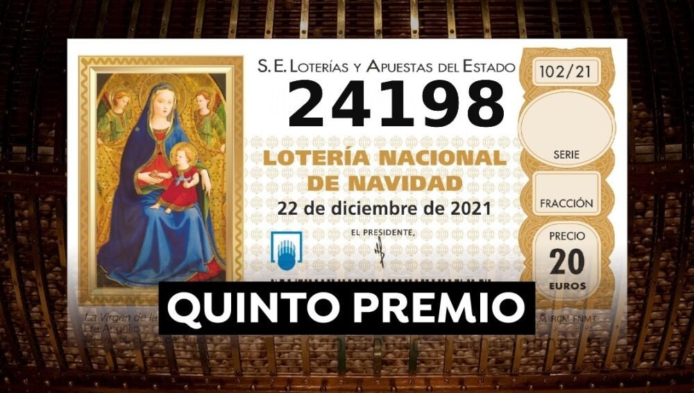 Concretamente, a las 11:48 horas de este 22 de diciembre ha salido el cuarto quinto premio de la Lotería de Navidad 2021, el número 24.198. El primer quinto premio es el número 92.052, el segundo quinto premio el 70.316, el tercer quinto premio el 26.711, el cuarto quinto premio el 24198, el quinto quinto premio el 69457 y el sexto quinto premio el 89053.