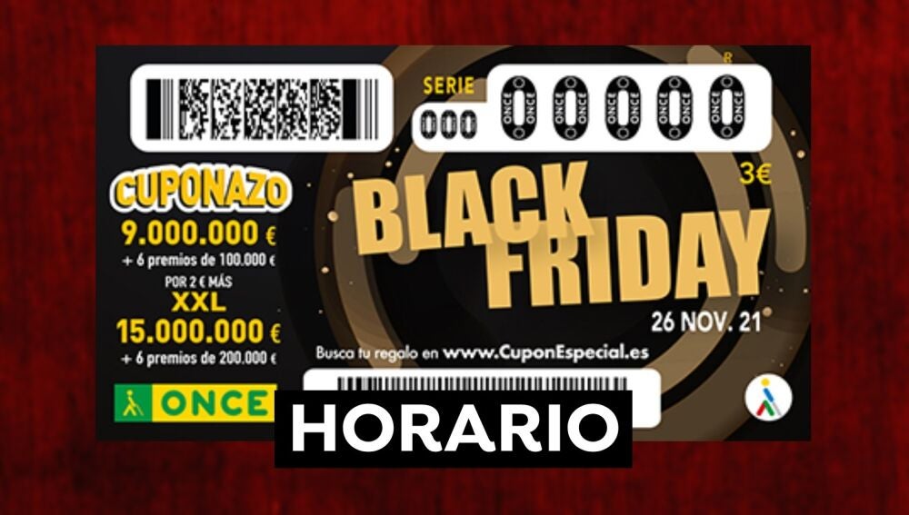 El sorteo del Cuponazo especial Black Friday de la ONCE se celebra hoy, viernes 26 de noviembre, entre las 21:15 y 21:30 horas (hora peninsular). Puedes seguir en directo el sorteo ONCE del Black Friday desde la página web de Antena 3 Noticias y comprobar tu número y el resultado del sorteo de la ONCE de hoy al momento. Además, también puedes verlo en diferido a través de JuegosONCE en la página de Retransmisión de sorteos.