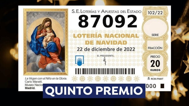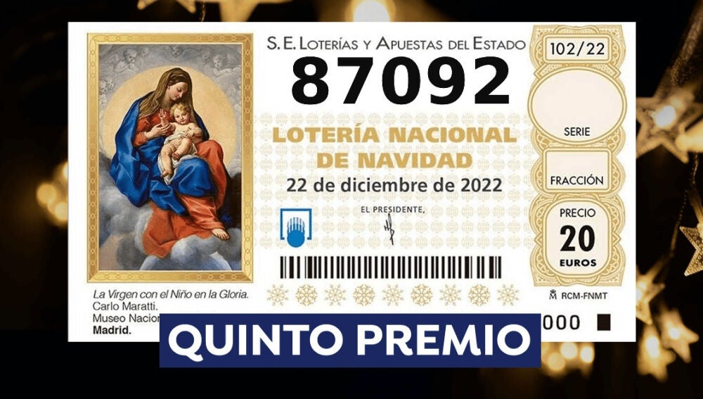 El último quinto premio del Sorteo Extraordinario de Navidad 2022, el octavo, ya se ha dado a conocer. El número agraciado es el: 87.092 y ha salido a las 12:45 horas. Recordamos que los quintos premios son agraciados con 60.000 euros la serie. Cada décimo agraciado son 6.000 euros, es decir, 300 por euro jugado. Los quintos premios son los grandes premios del Sorteo de Navidad que menor cuantía de dinero reparten. Sin embargo, los afortunados que reciban uno de los 8 quintos premios no tendrán que declararlo a Hacienda, ya que no alcanzan los 40.000 euros.