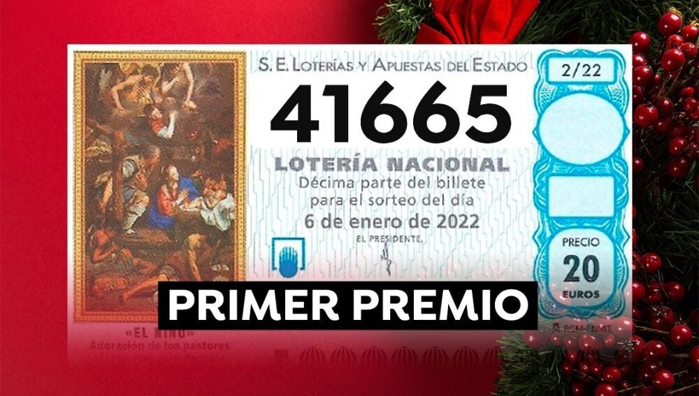 Ya conocemos el primer premio del Sorteo Extraordinario de Navidad que se celebra hoy, 6 de enero de 2022. El número agraciado es el 41665. El primer premio de la Lotería del Niño está dotado de 2.000.000 de euros a la serie, 200.000 euros por décimo.