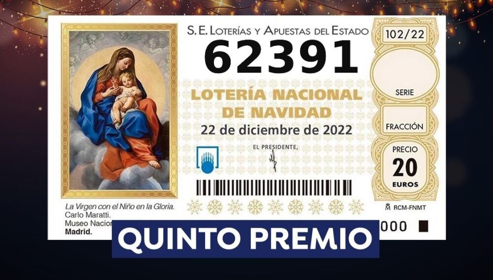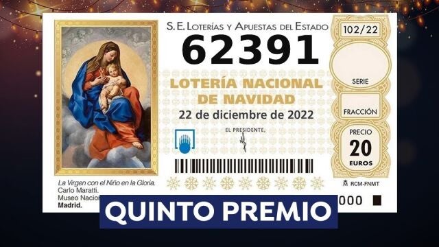 El décimo 62.391 ha sido agraciado con un primer quinto premio en el Sorteo Extraordinario de la Lotería de Navidad de 2022 celebrado este jueves en el Teatro Real de Madrid. Cada décimo de este número tiene un premio de 6.000 euros y la serie completa asciende hasta los 60.000 euros.