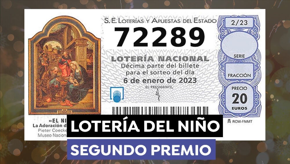 El 72289 ha sido el Segundo Premio del Sorteo Extraordinario del Niño 2023. Está dotado de 750.000 euros a la serie, es decir, 75.000 euros al décimo.