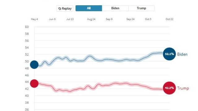 El candidato del partido demócrata estaría 11 puntos porcentuales por encima de su rival Donald Trump, lo que le daría el 53% de los votos frente al 42% del actual presidente de Estados Unidos. Estos son datos de un sondeo elaborado por la Universidad del Sur de California y publicado el lunes. La encuesta del Investor's Business Daily también da la mayoría a Joe Biden, pero solo por 7 puntos.