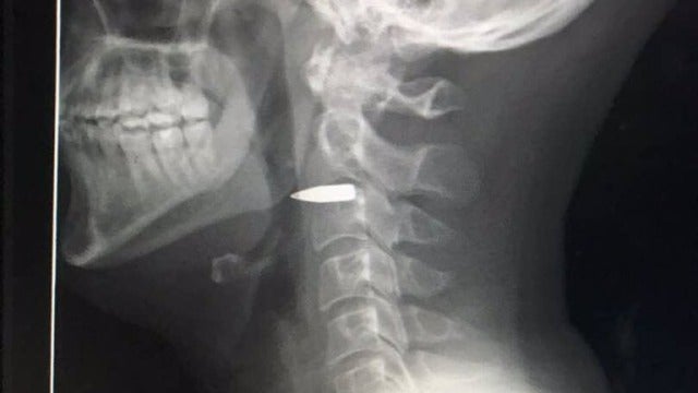 Fue trasladado de urgencia al hospital donde le hicieron una radiografía en la que se ve la bala alojada en su cuello.