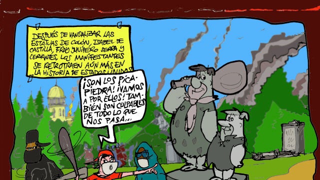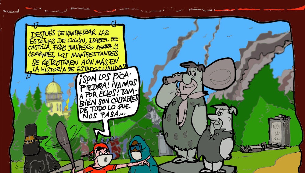 Nuestro ilustrador, Alfredo Boto-Hervás, ha puesto su particular mirada en estos incidentes. De forma irónica, bromea con que 'Los Picapiedra' podrían ser las próximas víctimas de los actos vandálicos en Estados Unidos. "A por ellos, también son culpables de todo lo que nos pasa", dice uno de los manifestantes en la viñeta.
