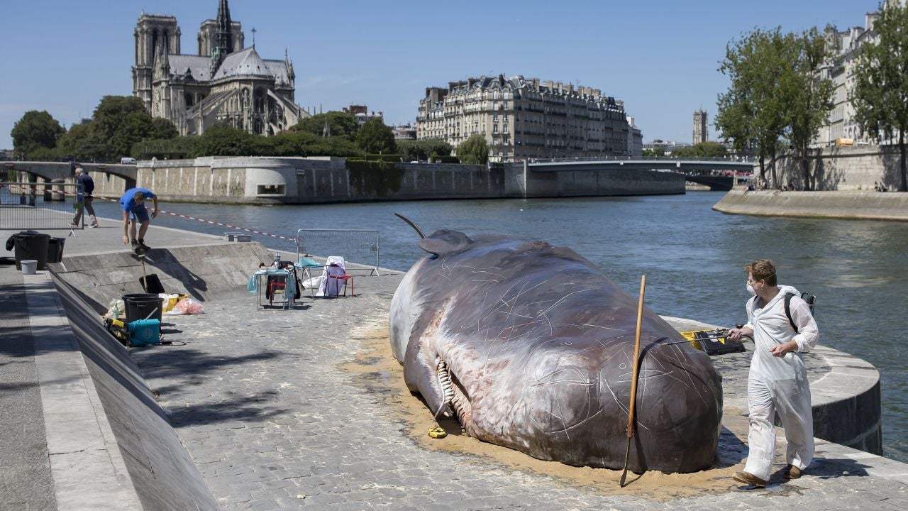 El cuerpo sin vida de un 'cachalote' ha aparecido en París, en el borde del río Sena y a pocos metros de la catedral de Notre Dame, encallado por un colectivo de artistas que con esa escultura hiperrealista quiso concienciar sobre el cambio climático y la pesca intensiva. Frente a la mirada atónita de los paseantes, varios hombres equipados con monos blancos arrojaban agua sobre el falso cetáceo de 15 metros de largo, que permanecerá en la capital francesa hasta el próximo lunes.