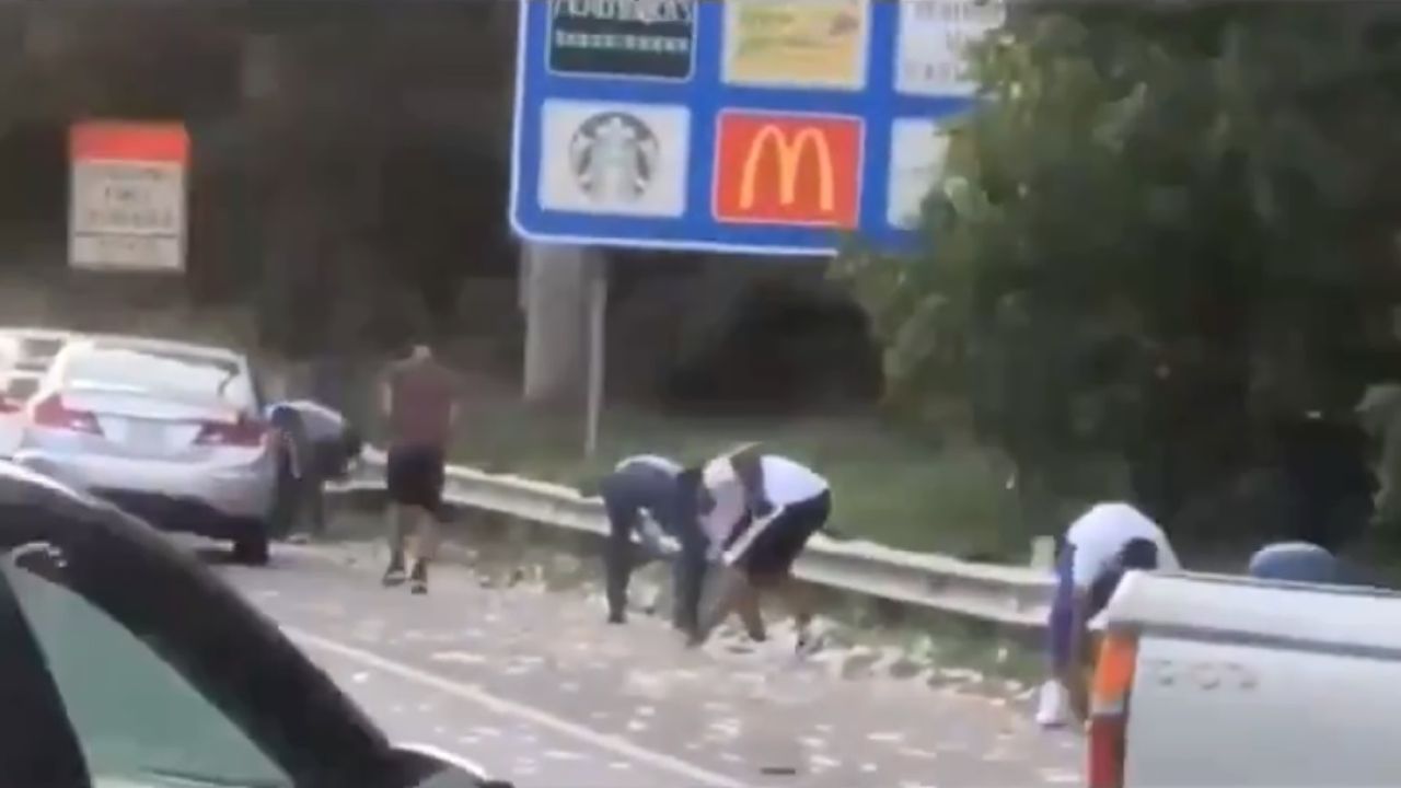 Una autopista concurrida en los suburbios de Atlanta se convirtió en el día de la lotería para docenas de conductores. Fueron muchos los que se detuvieron y salieron de sus vehículos cuando la puerta de un camión blindado se abrió accidentalmente derramando dinero en efectivo por todas partes.