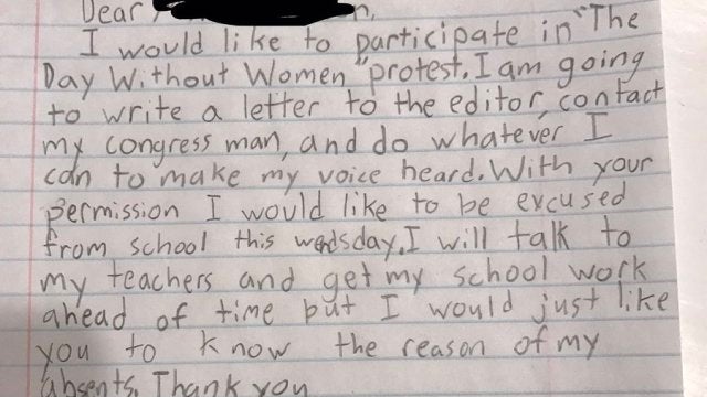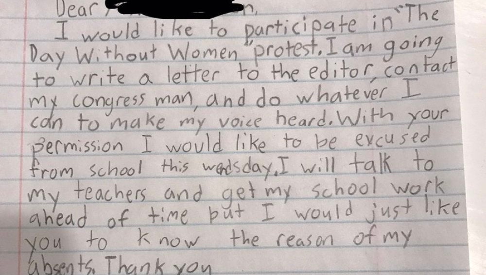 "Me gustaría participar en la protesta del 'Día sin mujeres'. Voy a escribir una carta al director y hacer lo que pueda para hacer oír mi voz. Con su permiso, me gustaría no ir al colegio el miércoles. Hablaré con mis profesores y voy a tener listos mis deberes antes, pero me gustaría que supiera la razón de mi ausencia".