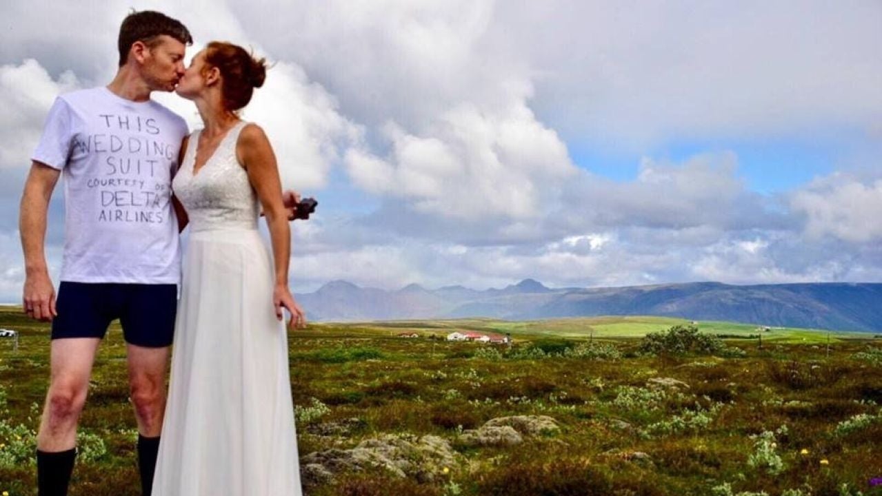 El novio se tomó el error con humor y publicó en la red social Reddit una foto el día de la ceremonia en la que se le ve, junto a la novia, en ropa interior y con una camiseta que pone "Este traje de boda cortesía de Delta Air Lines".